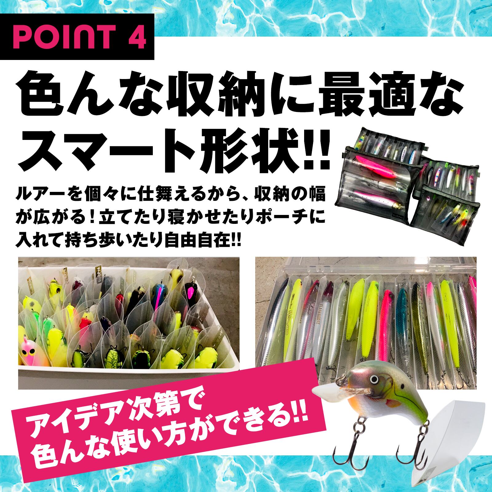 【■選べる3サイズ】●Sサイズ12個:180mm×50mm(中型ミノー、〜140mmサイズルアーなど)●Mサイズ7個:230mm×75mm(大型ミノー、ジョイントルアーなど)●Lサイズ5個:320mm×95mm(ビックベイトなど)